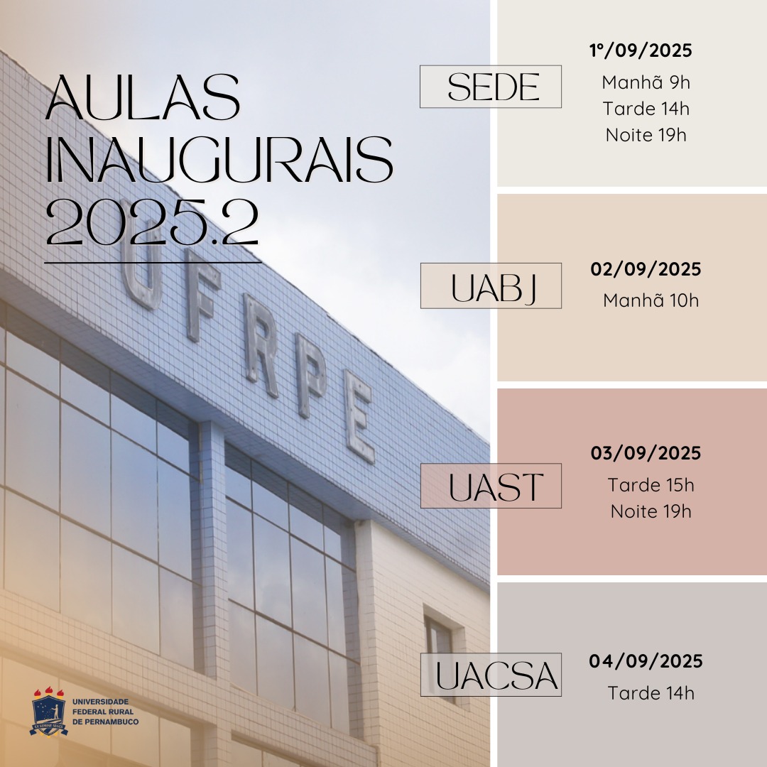 A UFRPE dá as boas-vindas à comunidade universitária para o semestre 2025.2 no próximo dia 1º/09 para os(as) ingressantes do Recife e da Unidade Acadêmica de Educação a Distância (UAEADTec). No dia 2/09, a aula será realizada na Unidade Acadêmica de Belo Jardim (UABJ). No dia 3/09, na Unidade Acadêmica de Serra Talhada; e, em 4/09, na Unidade Acadêmica do Cabo de Santo Agostinho (UACSA).