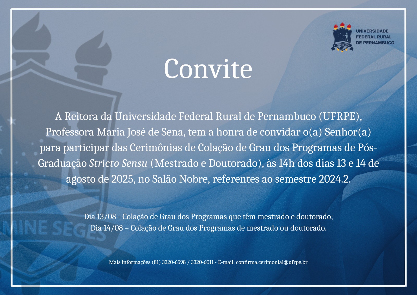A UFRPE realizará as Cerimônias de Colação de Grau dos Programas de Pós-Graduação Stricto Sensu (Mestrado e Doutorado), nos dias 13 e 14 de agosto, às 14h, no Salão Nobre, referente ao semestre 2024.2.