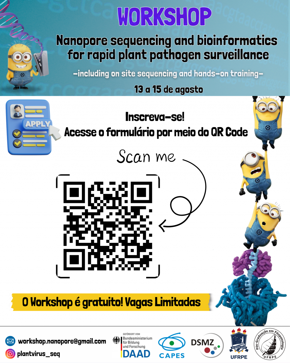 Durante os dias 13 a 15 de agosto, será realizado um Workshop sobre sequenciamento Nanopore e bioinformática para detecção de fitopatógenos, no programa de pós-graduação em Fitopatologia da UFRPE.